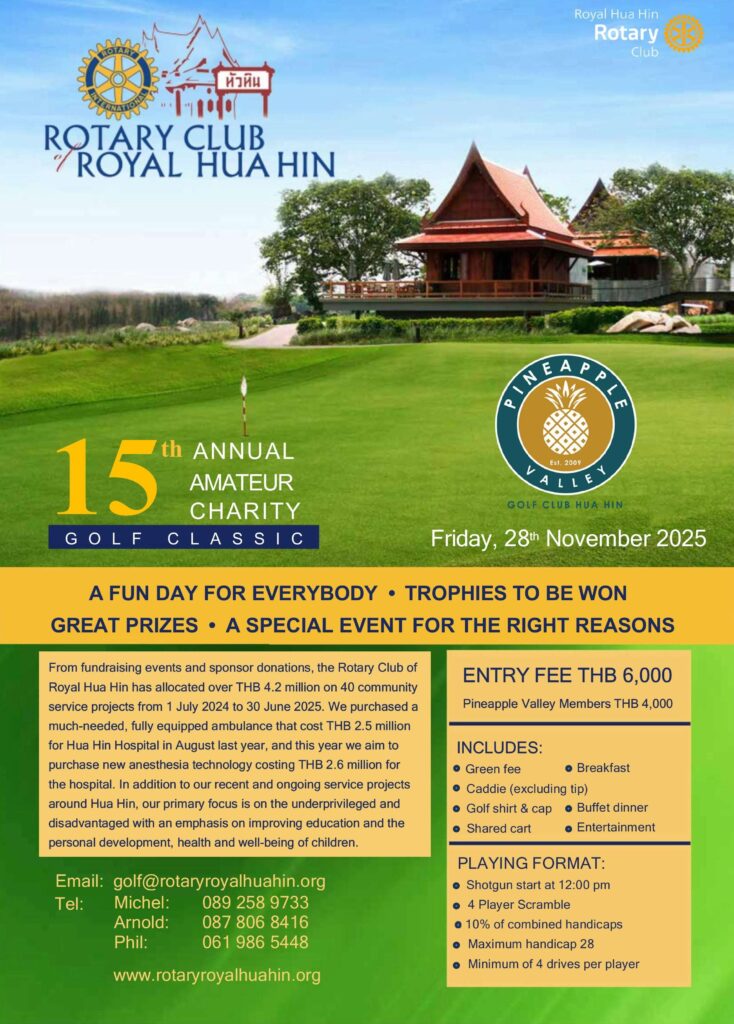 The Rotary Club of Royal Hua Hin is once again inviting golfers to take part in one of Hua Hin’s most anticipated charity events — the 15th Annual Amateur Charity Golf Classic, taking place on Friday, 28 November 2025, at Pineapple Valley Golf Club Hua Hin.