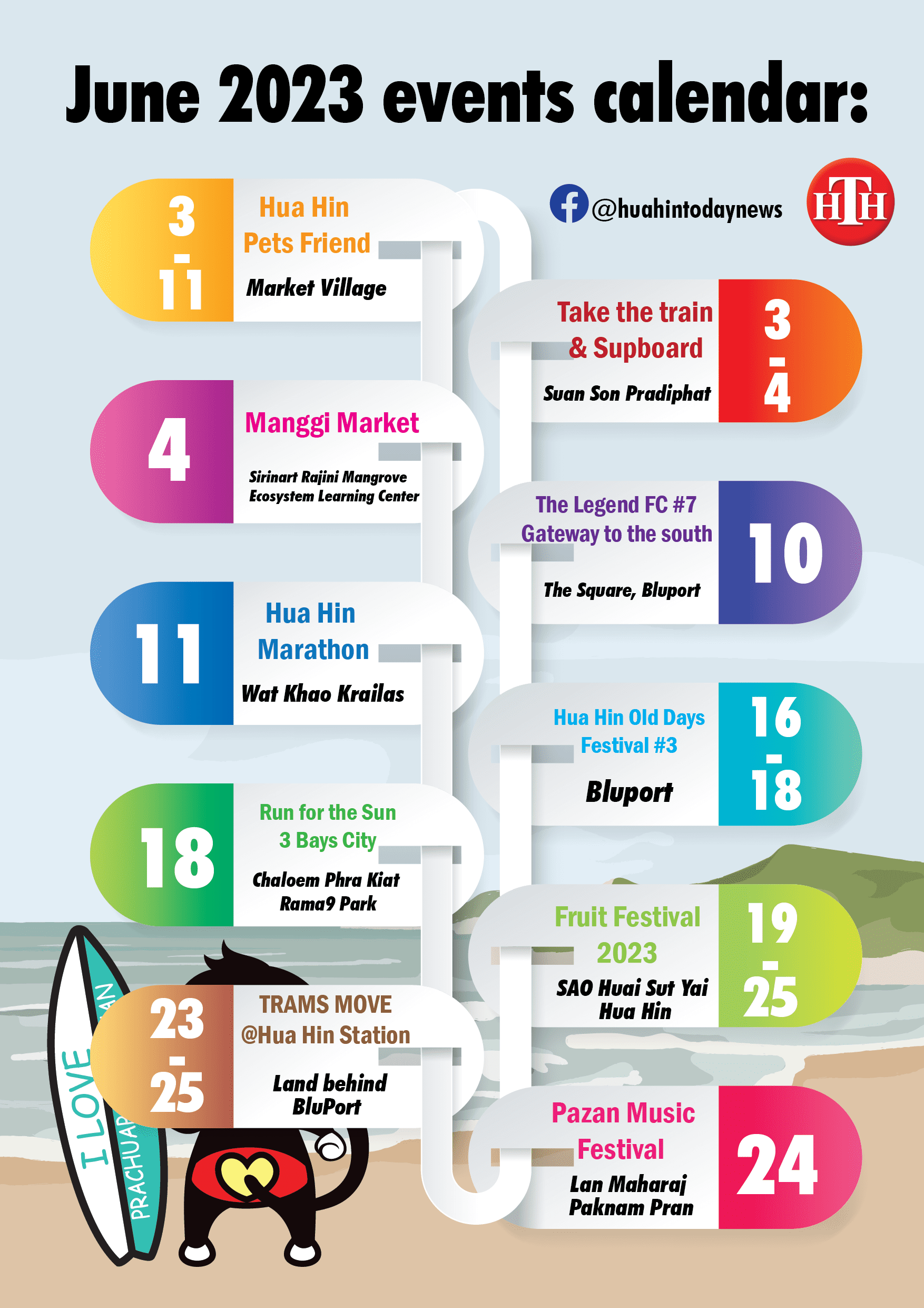 These include the Hua Hin Pets Friends 2023 event which will take place from June 3rd to 11th at Market Village Hua Hin, as well as the The Legend FC #7 Gateway to The South Muay Thai event will take place on June 10th at the Square in front of Blueport Hua Hin.