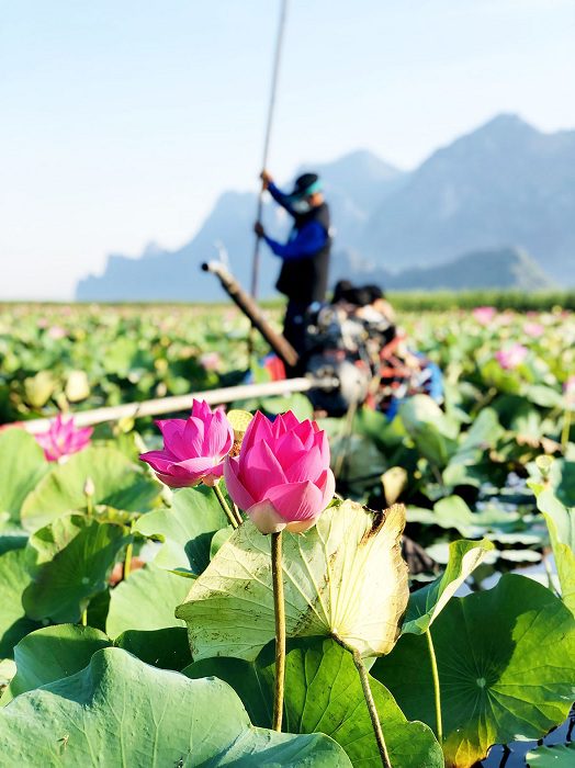 The lotus flowers grow amidst the specular backdrop of the large limestone mountains at Khao Sam Roi Yot.