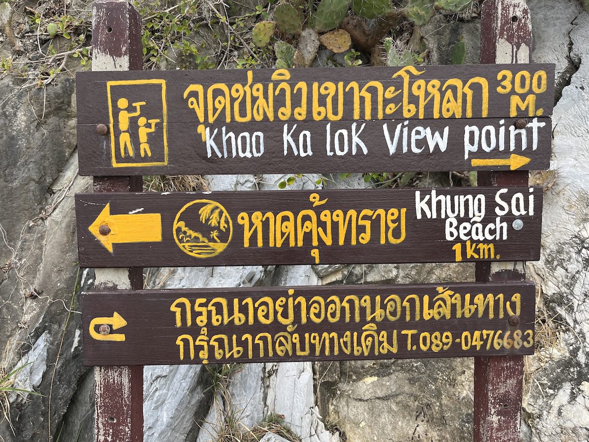 On the opposite side of the entrance, a nice nature trail awaits, leading adventurers to Khung Sai Beach. You will see a sign that points left to Khung Sai Beach and right to the viewpoint.