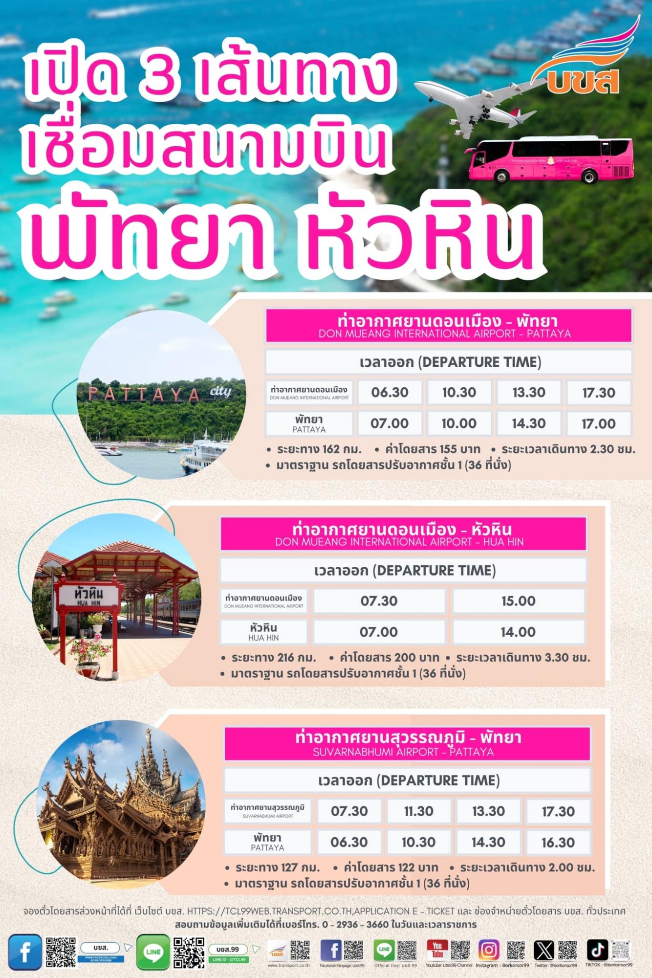 The Transport Company Limited (Bor Kor Sor) is set to launch three new bus routes connecting Don Mueang Airport and Suvarnabhumi Airport to Pattaya and Hua Hin, starting on 8 March.