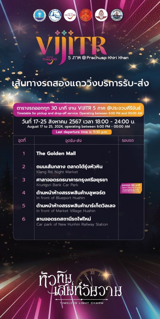 The event, themed “Hua Hin Timeless Light Charm,” promises to offer a unique experience, showcasing the town’s historical landmarks and rich culture through modern artistic techniques.