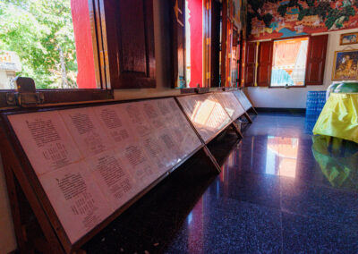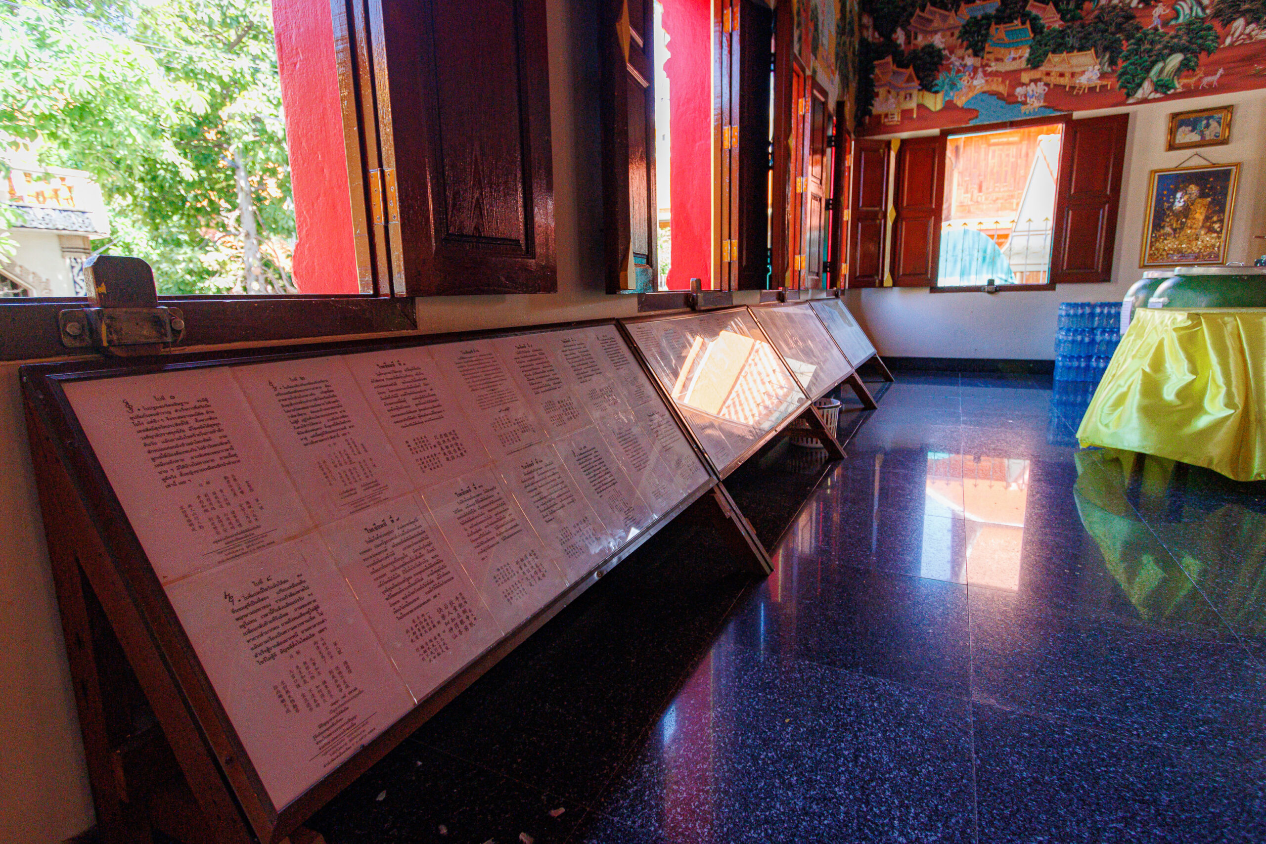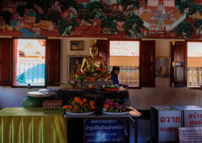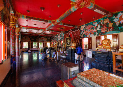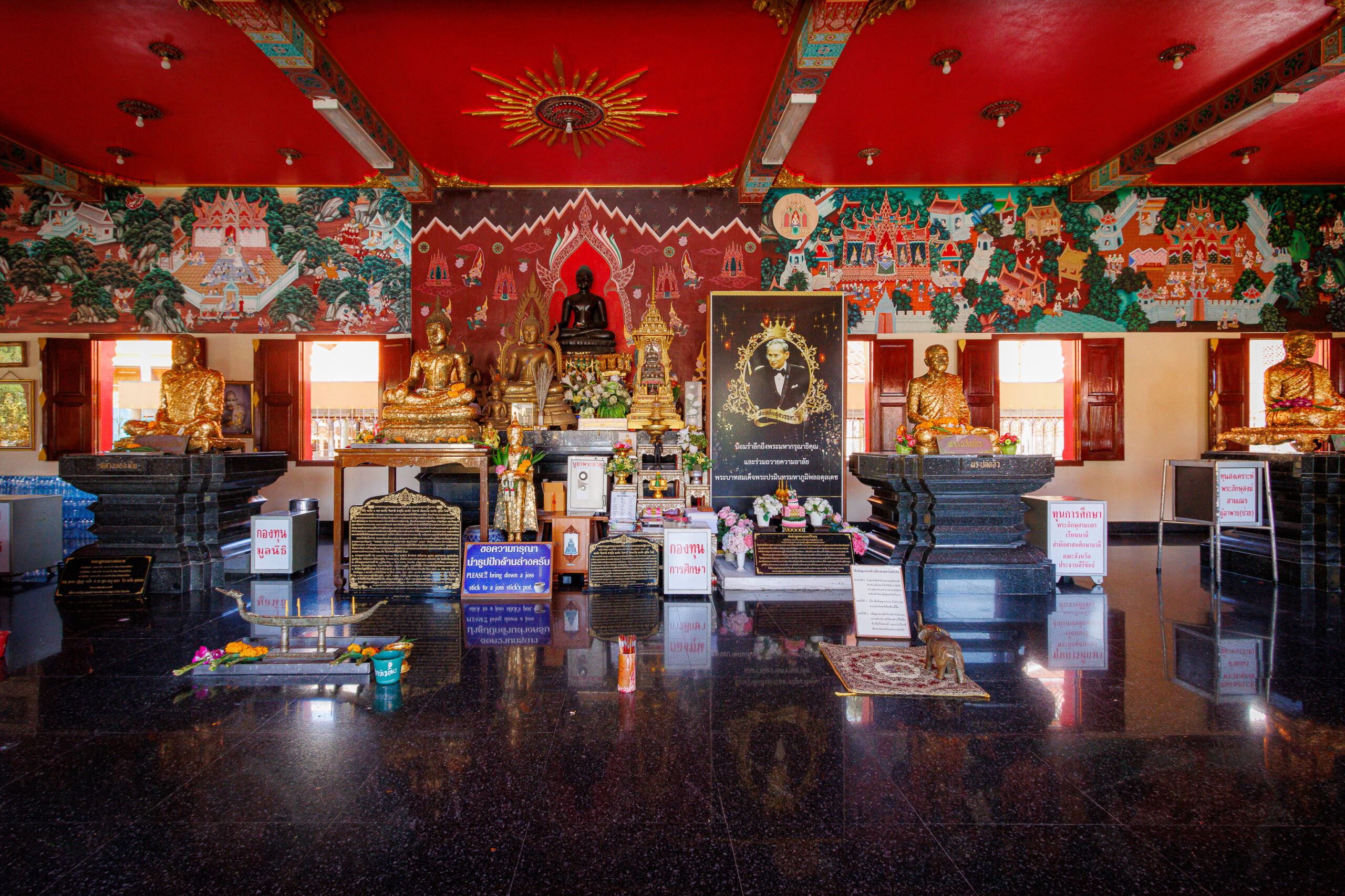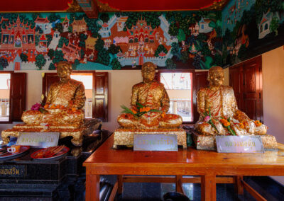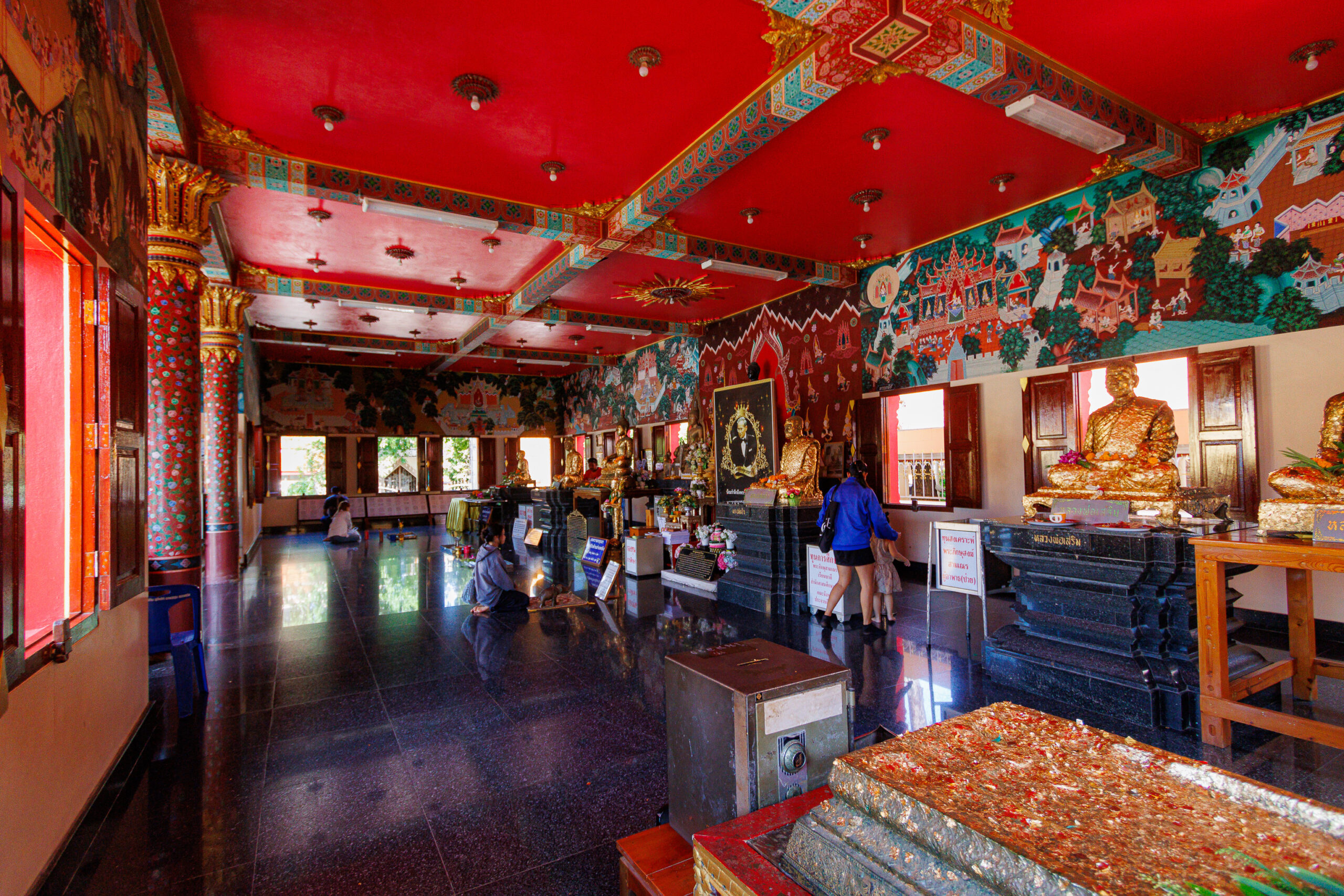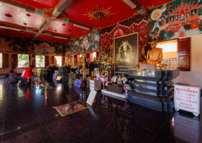 Inside the temple, visitors can find a Buddha image in the Maravijaya posture, a Buddha relic, a replica of the Buddha’s footprint, and cast images of Luang Pu Nak and other respected monks. The interior walls are decorated with murals depicting Jataka tales – stories from the Buddha’s past lives – and the hall features open windows allowing for natural ventilation.
