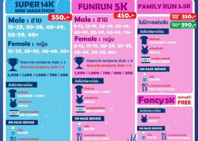 The programme begins at 5 a.m. with a baggage-drop service, followed by a warm-up session at 5:30 a.m. The Super Mini Marathon starts at 5:50 a.m., the Fun Run and Fancy Run at 6:10 a.m., and the Family Beach Run at 6:15 a.m.