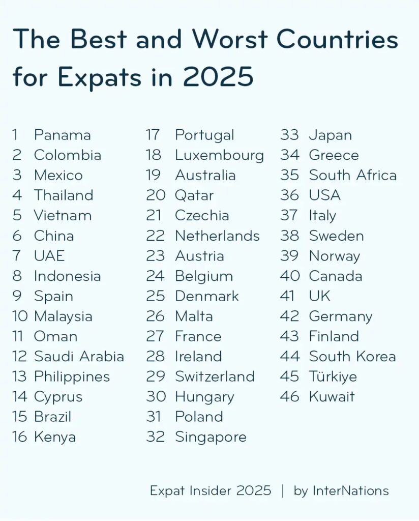 Canada and the UK were singled out for high living costs, with more than 60% of expats in each country unhappy with affordability, compared with a global average of 40%. South Korea dropped sharply by 25 places compared to 2024, reflecting growing concerns about cost of living.